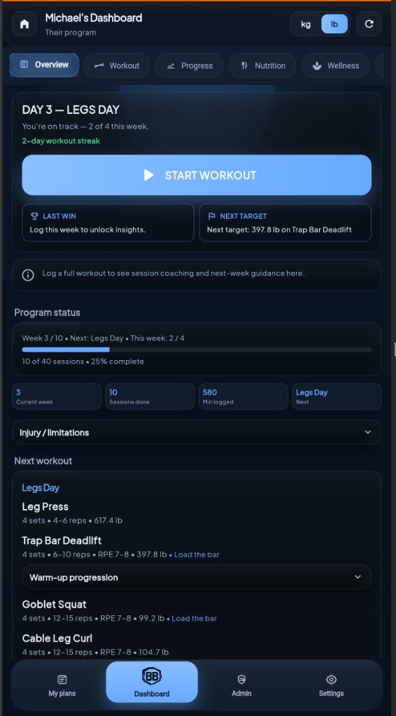 Builder, training dashboard, logging, progress, nutrition, and readiness—so execution stays tight and progression stays honest.